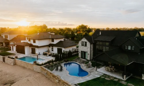AJ’s transformed this new home into a modern oasis with front landscaping, lighting and a complete transformation of the backyard, including decking, outdoor kitchen, fire pit, concrete decking, retaining walls and steps leading down to the beach.