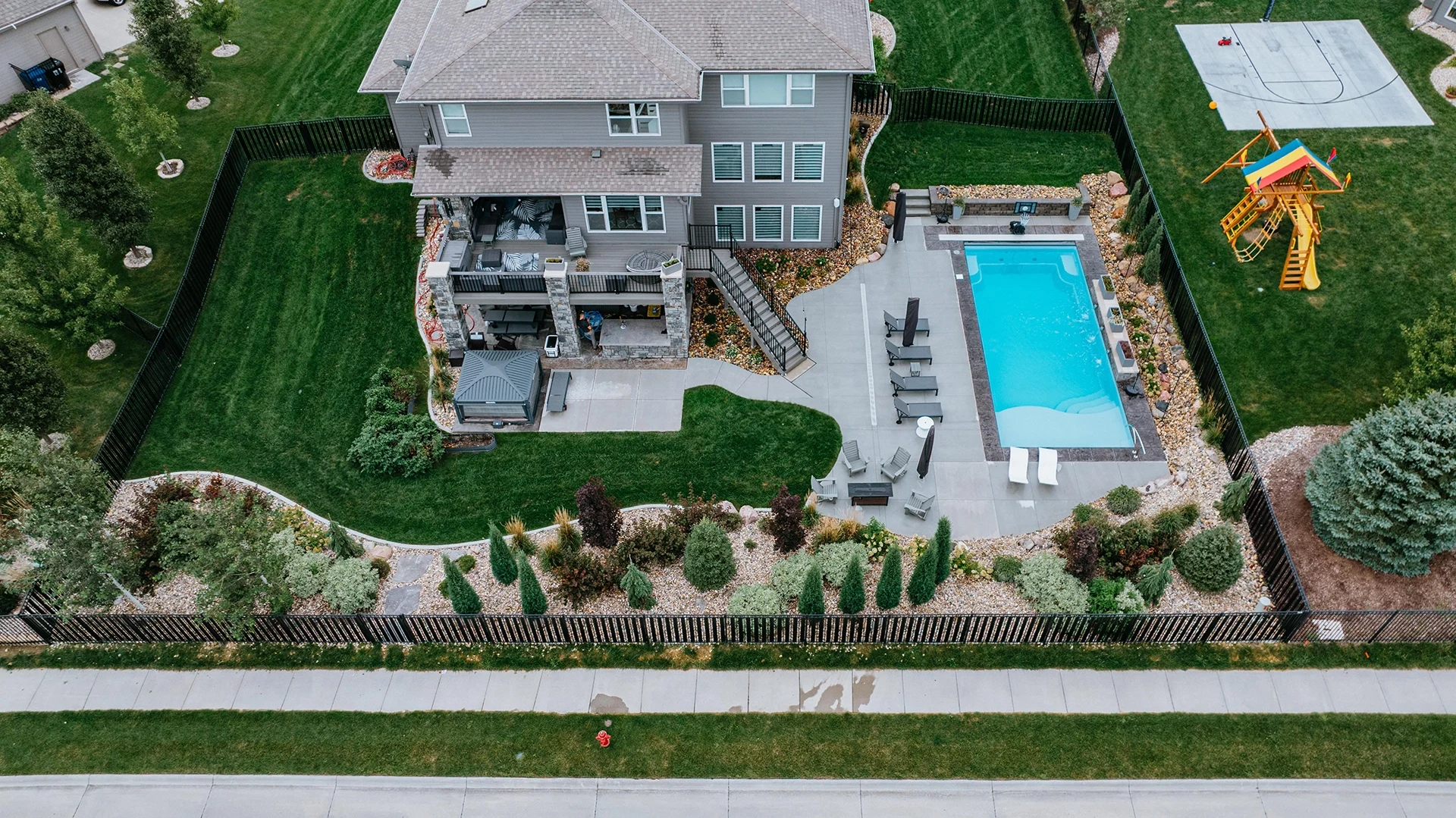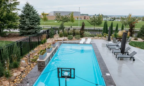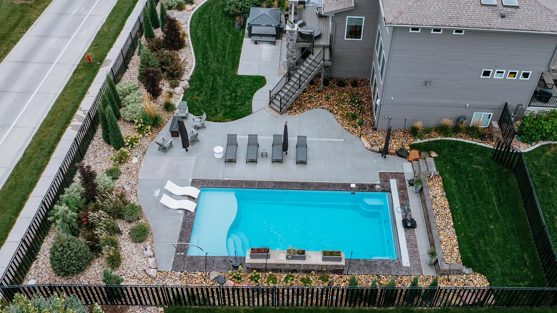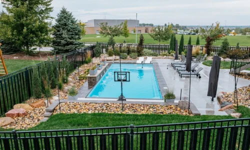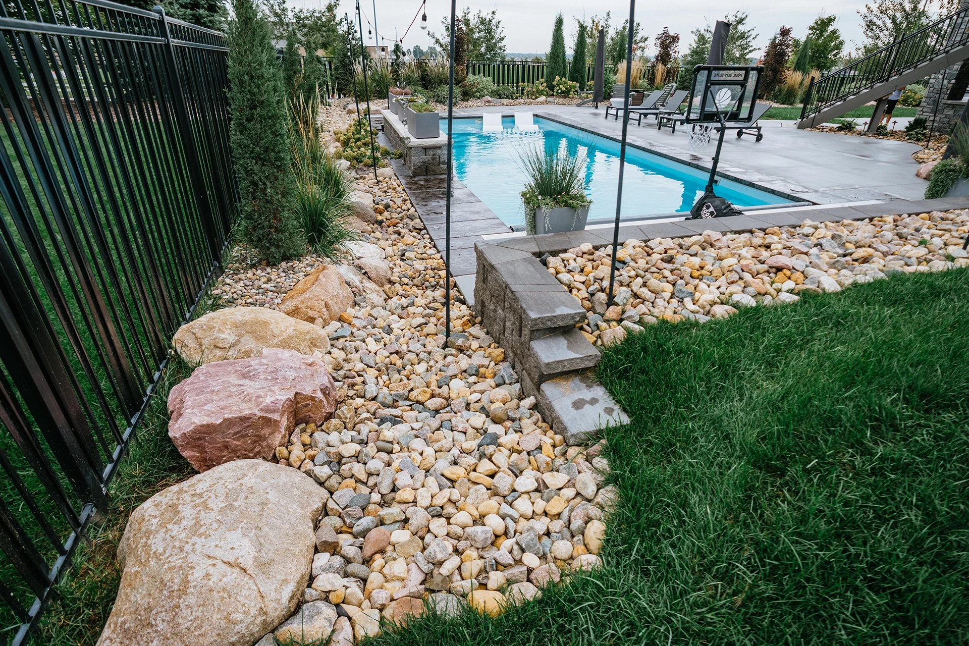 This family is enjoying a complete overhaul of their backyard space. The project was completed in two phases, with the back fence landscaping kicking it off. The following season, the pool with waterfall, patio deck, retaining wall and additional landscaping around the pool and stairs was created.