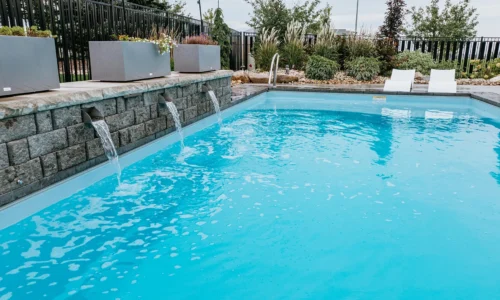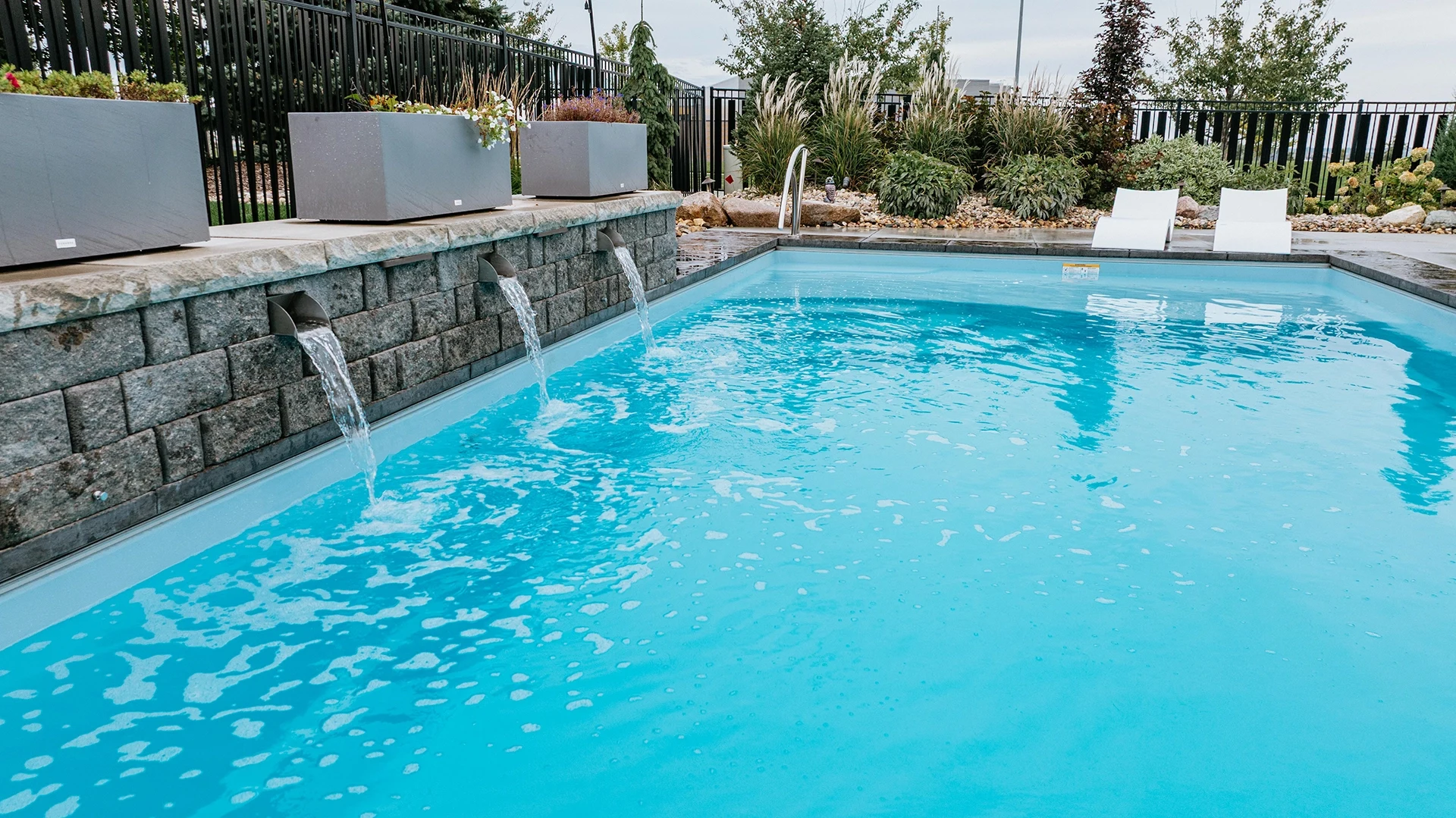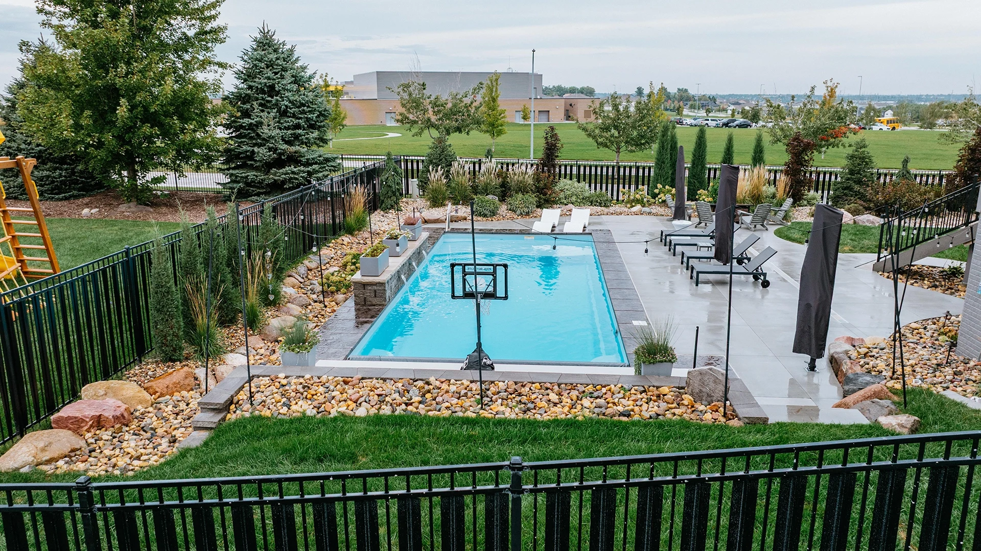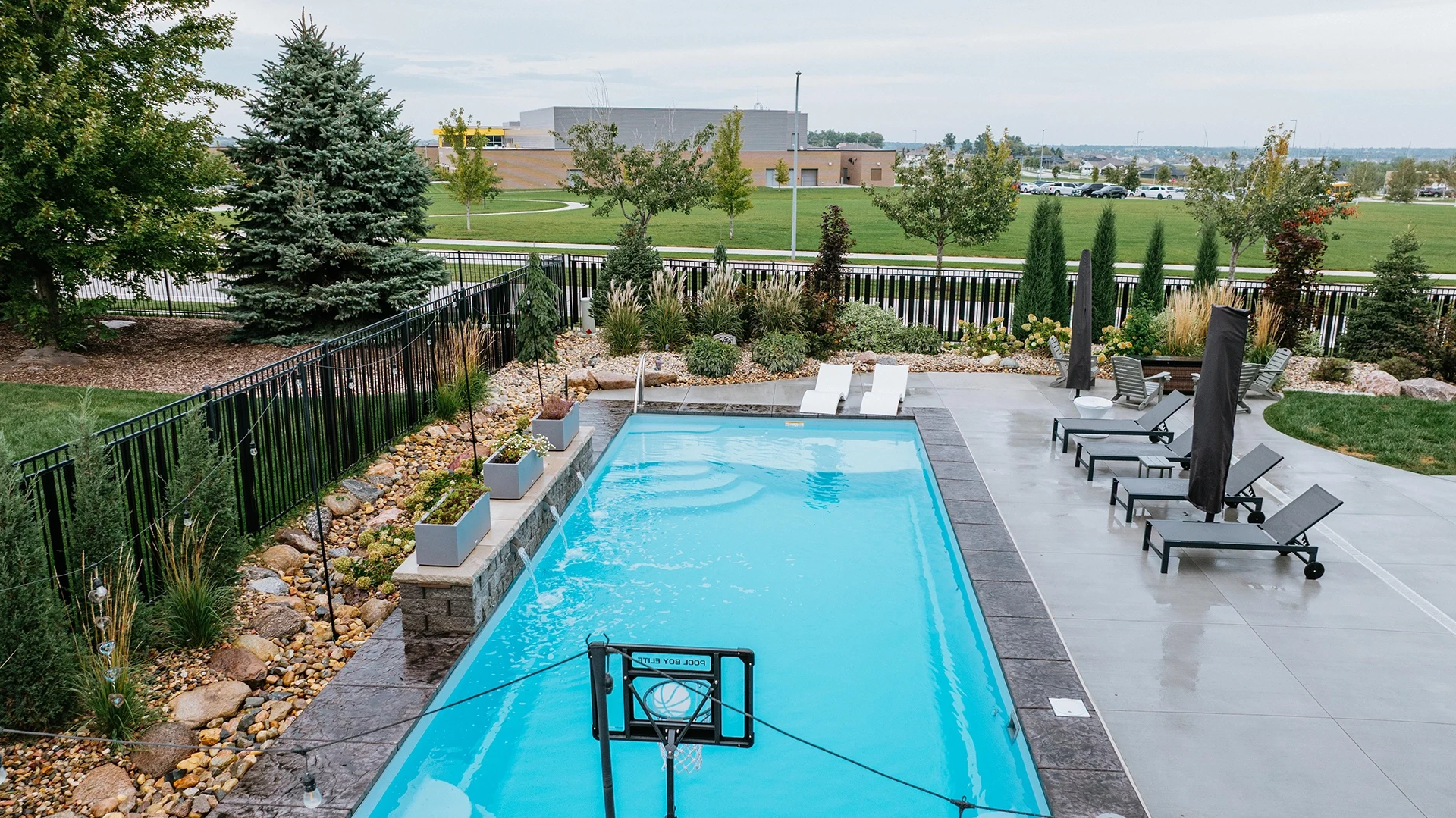 This family is enjoying a complete overhaul of their backyard space. The project was completed in two phases, with the back fence landscaping kicking it off. The following season, the pool with waterfall, patio deck, retaining wall and additional landscaping around the pool and stairs was created.