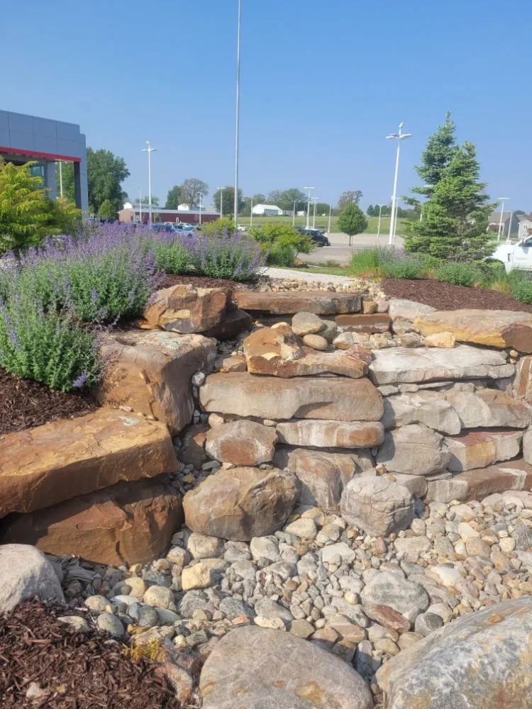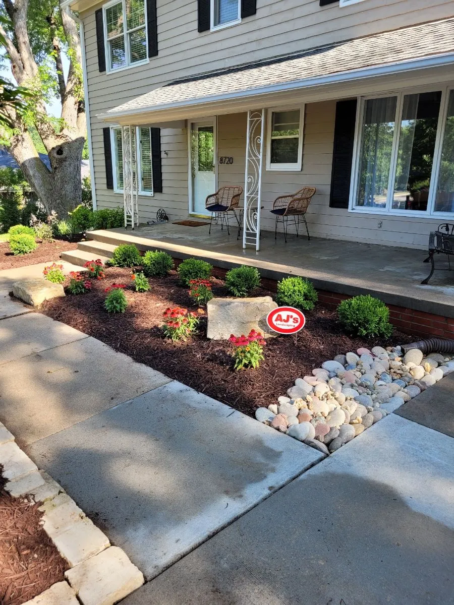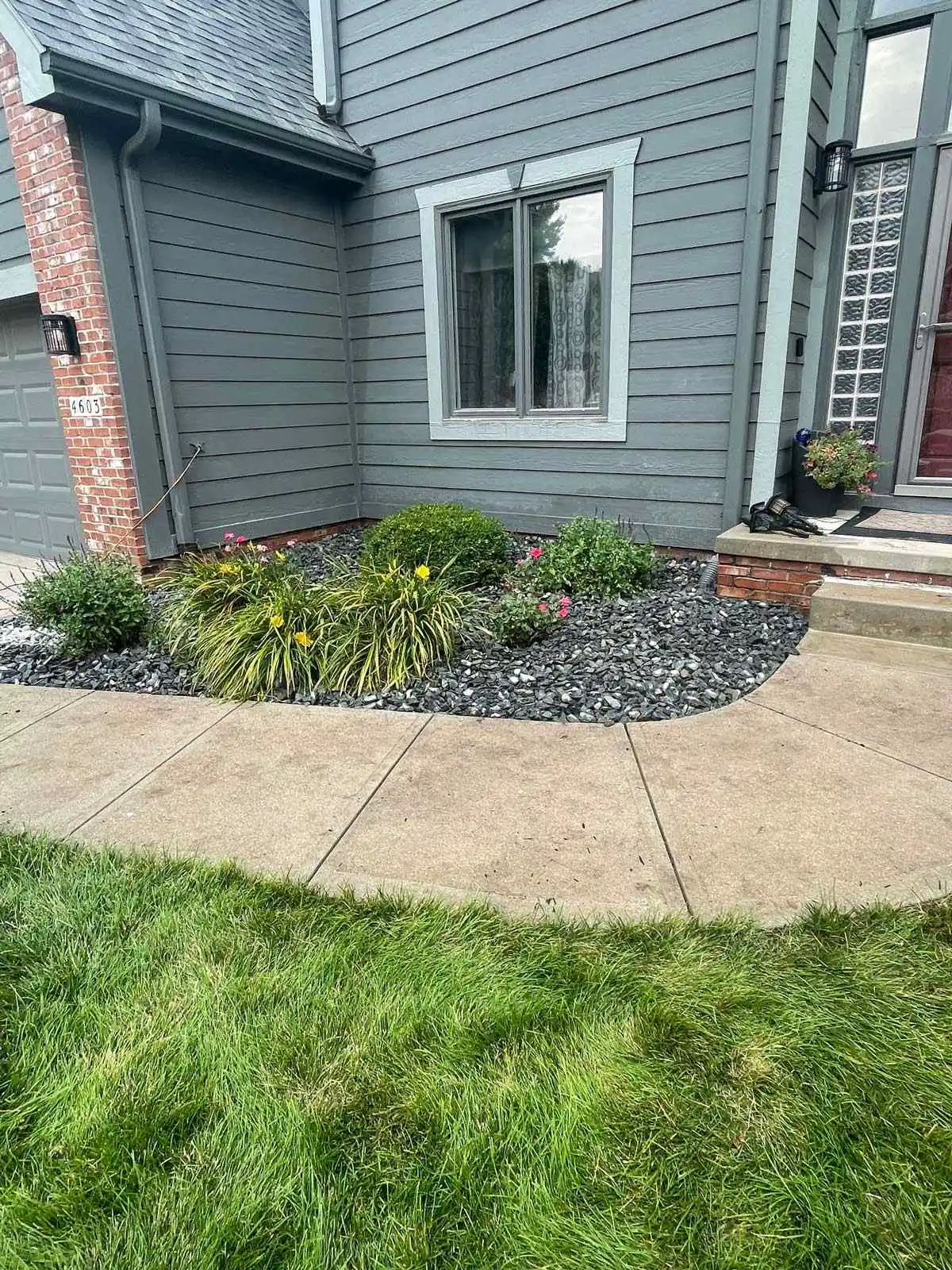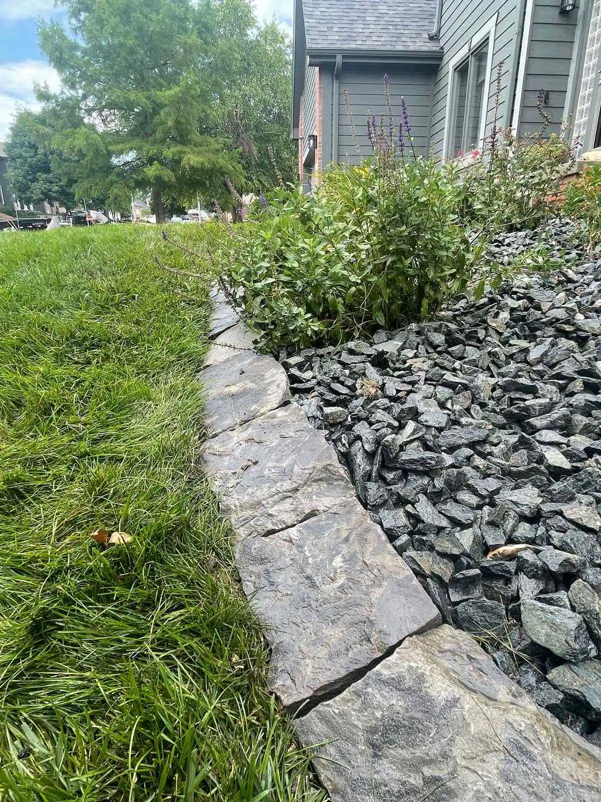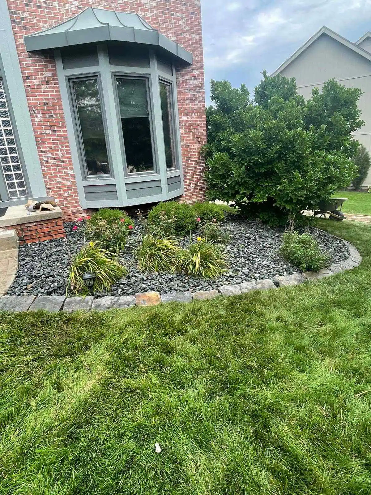 This project involves a bed cleanup to improve and update the landscape. We removed the existing mulch and installed new weed fabric and rock top-dress. Then, edged the bed with natural stone edgers.
