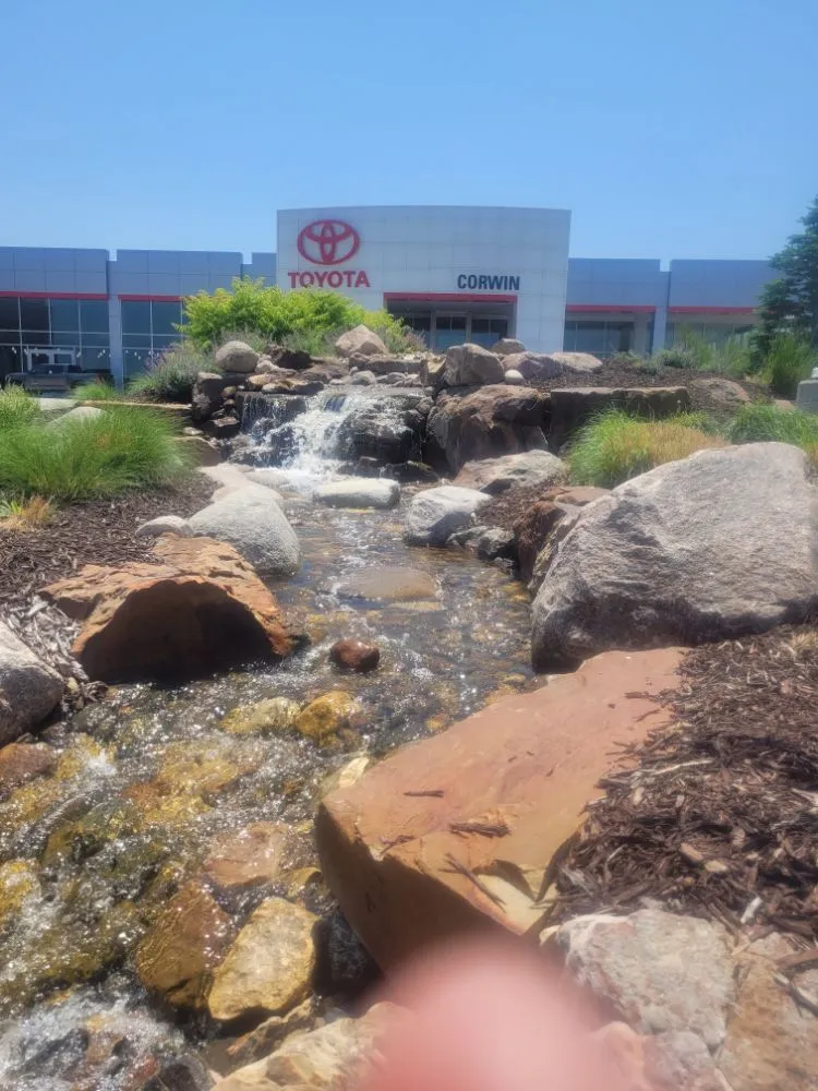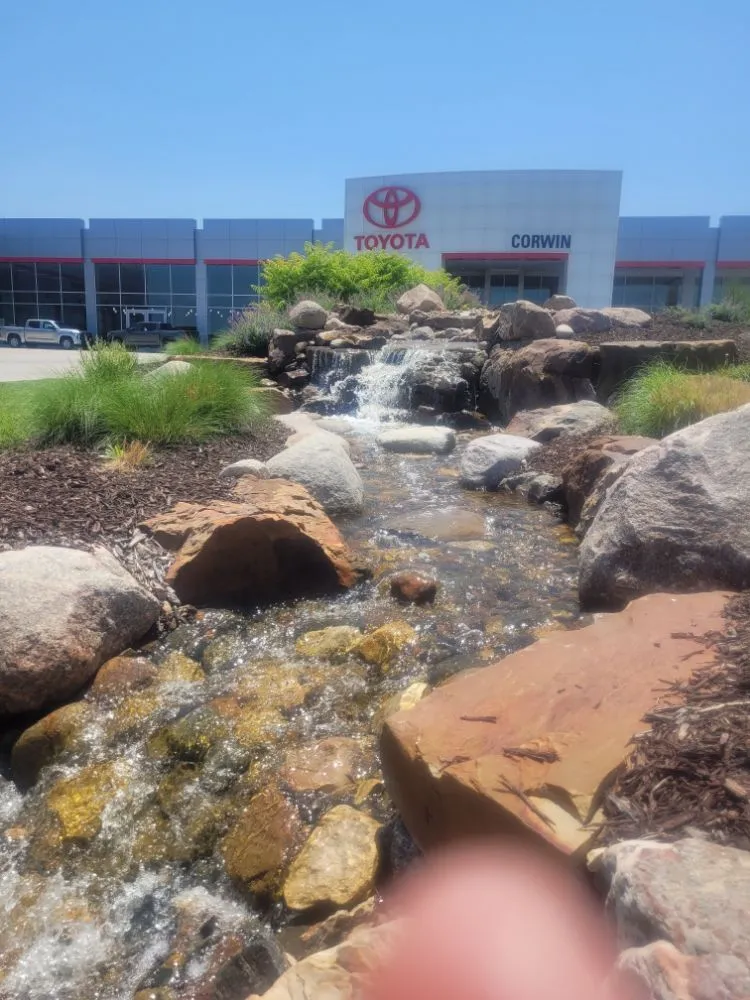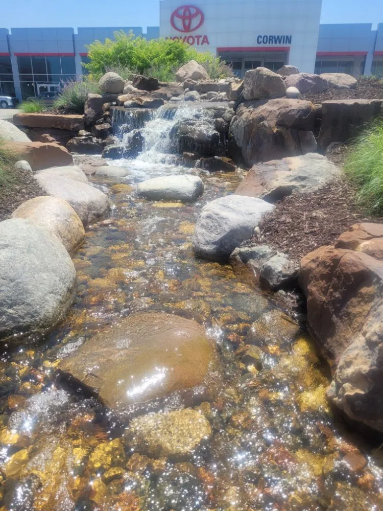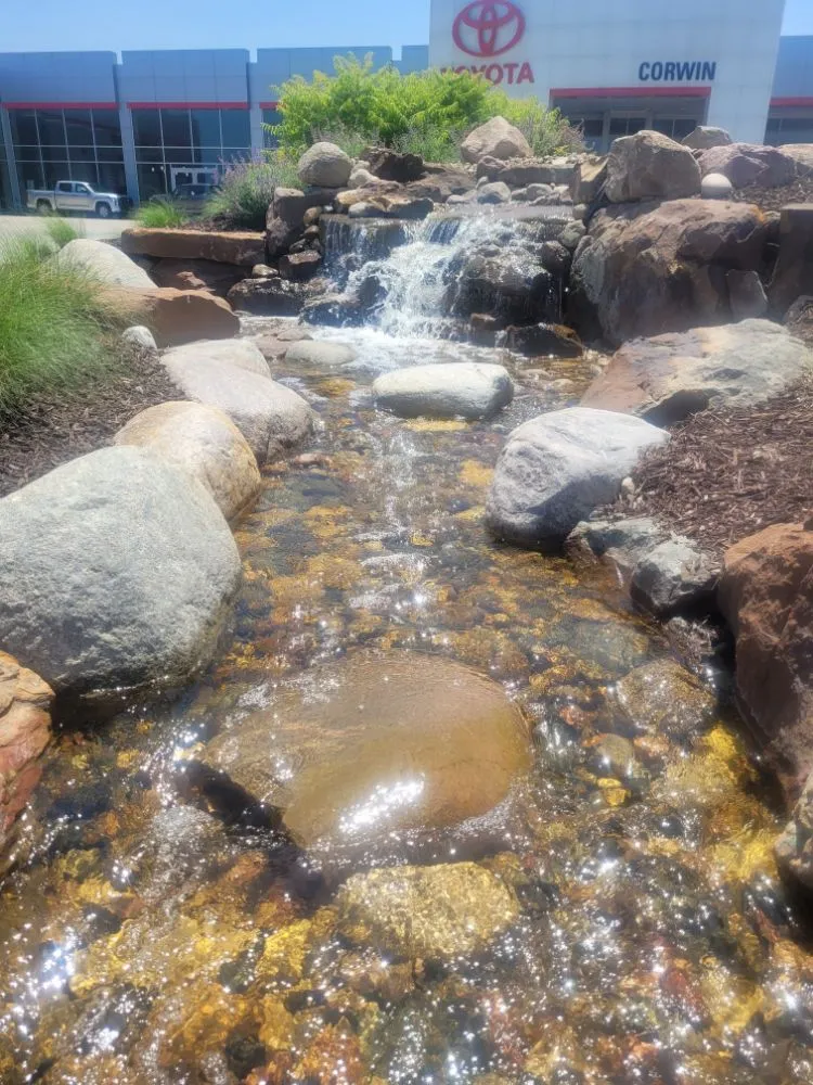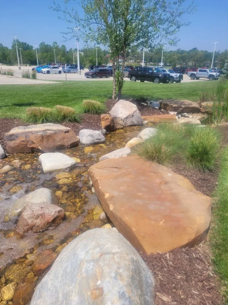 This particular project was a multi-step solution. The problem was that the pool deck did not drain properly so we cut out the dysfunctional concrete and installed a bigger drain and corrected the improper slope. We then graded the yard, removing 40 yards of dirt to create a dry creek bed and drainage swale to help with water flow and water build up. We installed the dry creek bed using 14 tons of rock and also created stone steps for better entry into the backyard area. We finished off the space and project by replanting plants throughout.