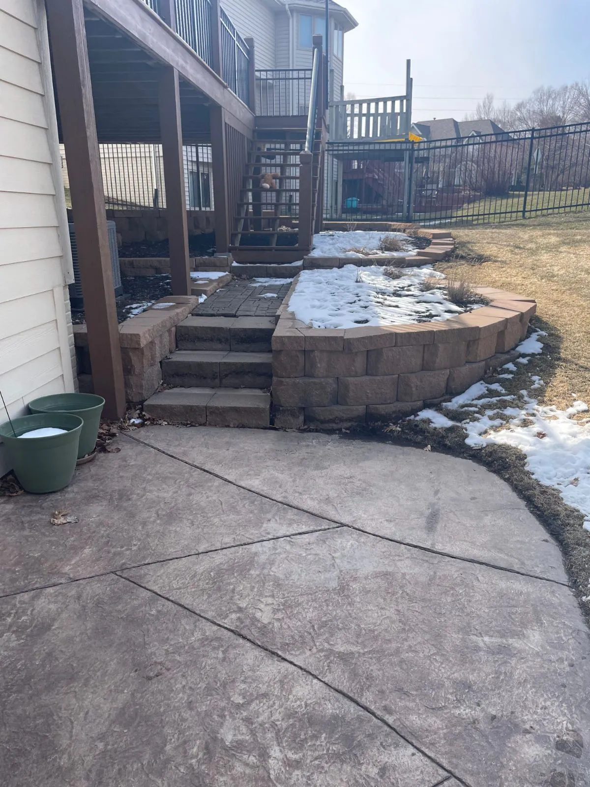 AJ Landscaping, a premier landscape service in Omaha, successfully transformed a client’s outdoor space plagued with various issues. The project involved addressing a deteriorated, cracked concrete patio, uneven stairs, and an inadequate paver walkway. Additionally, the client was struggling with multiple water-related problems on their property.